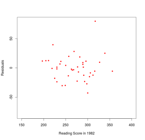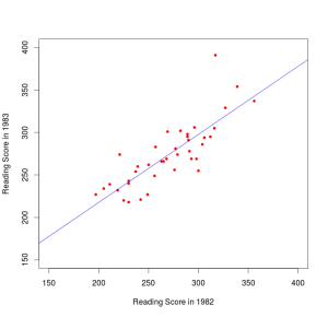 http://dananne.org/fu/courses/math-241/R/reading.txt contains data from a reading test administered to 40 elementary school students. The test was first given to the students in 1982 and then given a year later to the same students. The data is in a table, with the first column labeled “Y1982” and the second column labeled “Y1983”.